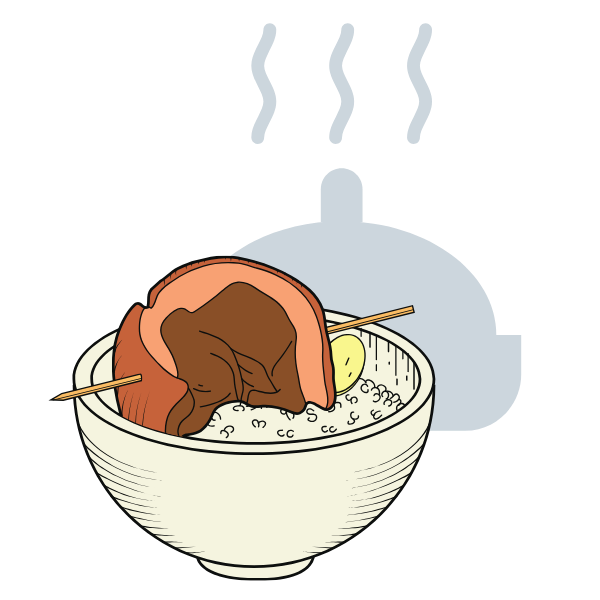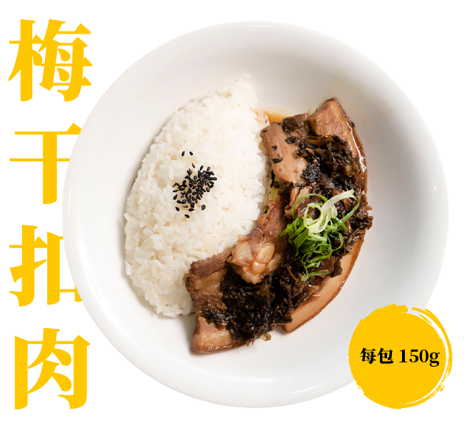 以特製滷汁熬煮上色,加入老梅干菜與辛香料炒香,軟Q的豬五花搭配鹹香梅干菜,解油膩十分對味,令人懷念的客家古早味。