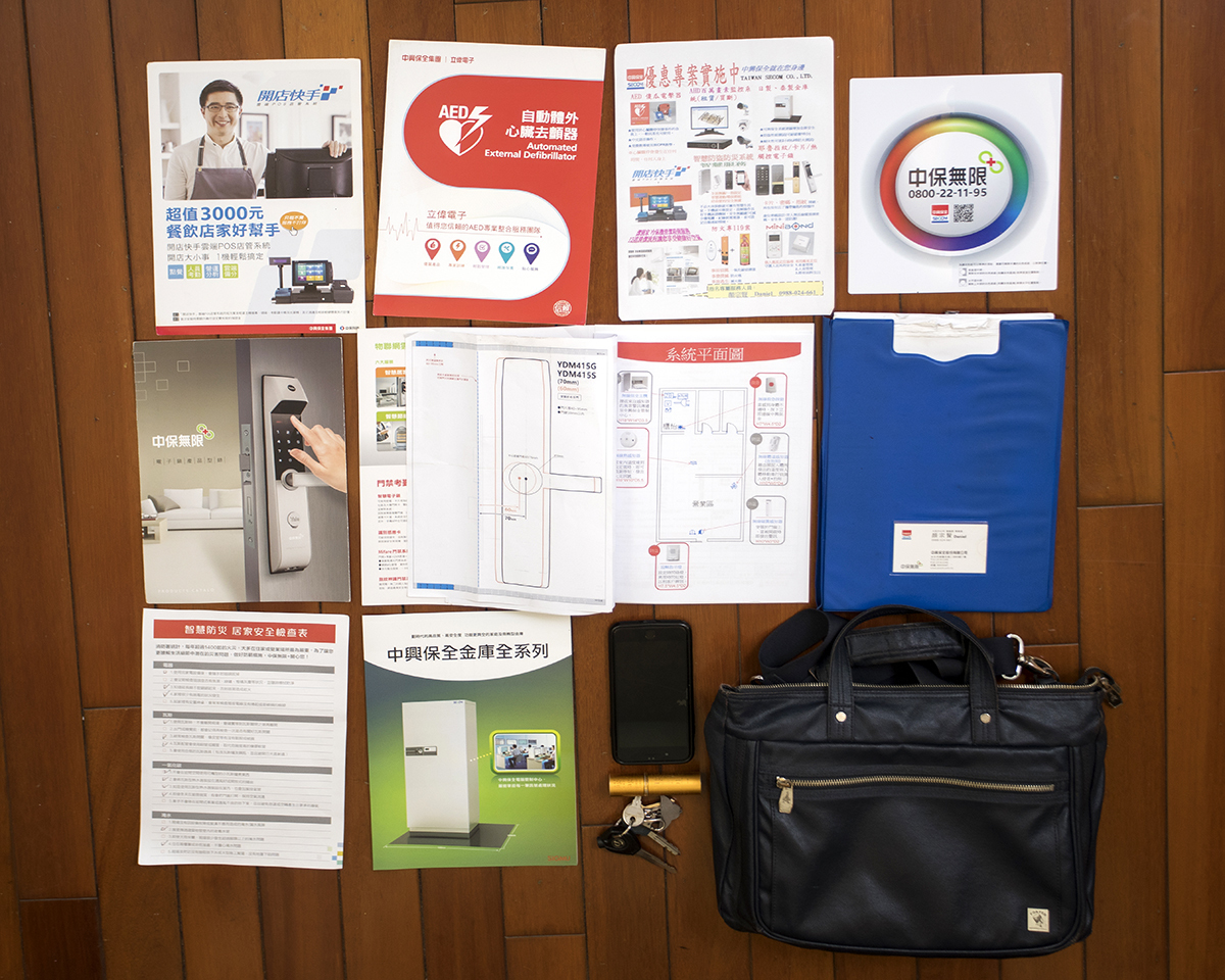 從事安全規劃師近2年的顏宗賢,對居家安全嗅覺特別敏銳,不僅仔細觀察屋內屋外,穿著西裝還爬上後陽台女兒牆檢查瓦斯管動線,最後還大方打開他的公事包,防災防盜資料齊備,攤開來九宮格都排不完,專業那一面表露無遺。