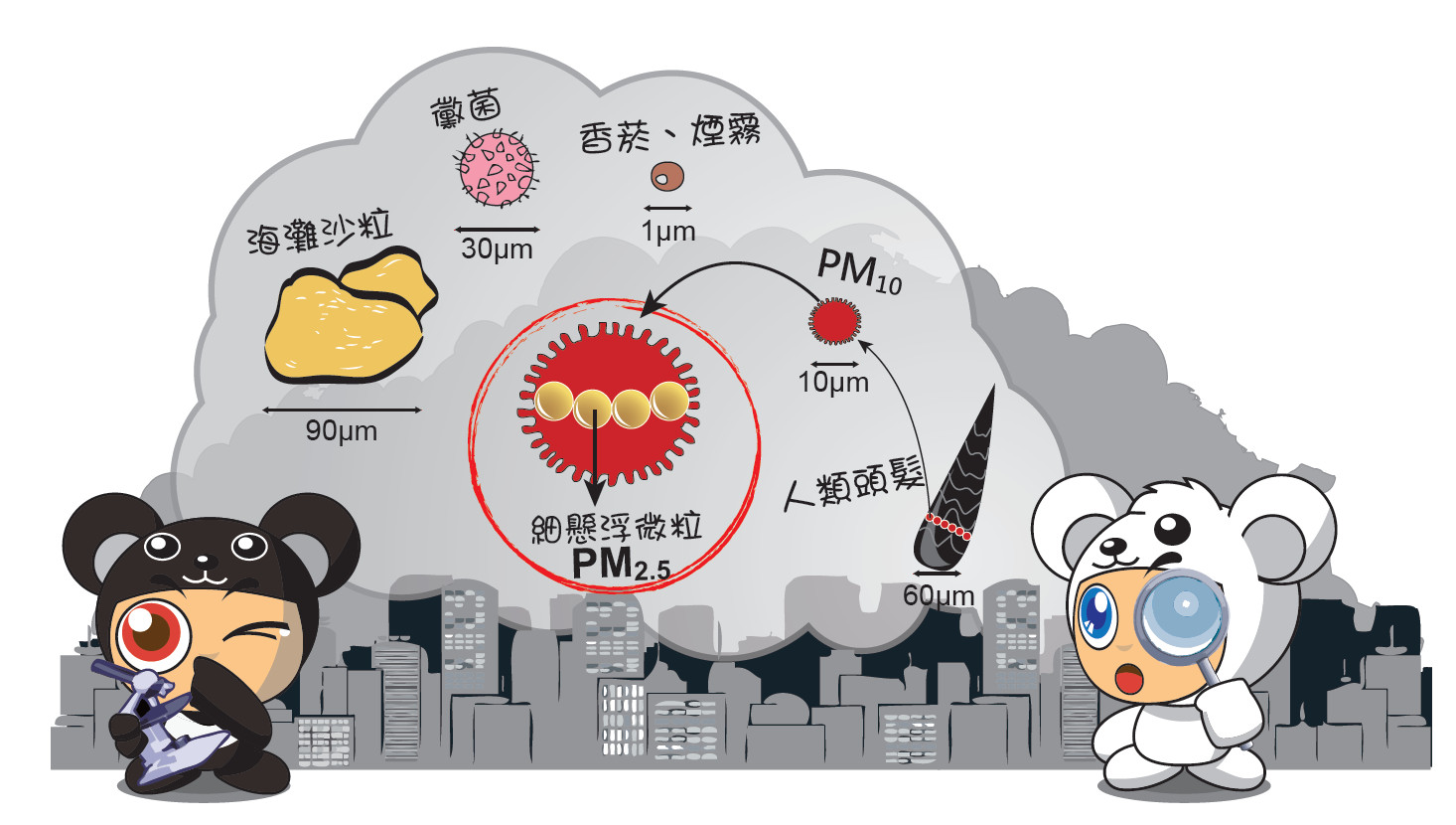 空氣中的汙染物很多,其中漂浮在空氣中「類似灰塵」的粒狀物稱為懸浮微粒(particulate matter, PM),通常我們說的PM2.5,就是懸浮微粒「小於或等於2.5微米(μm)」的粒子。